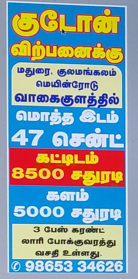 : MADURAI KOLAMANGALAM MAIN ROAD VAAGAIKULAM 47 CENT BULING 8,500 SQ FEET KALAM 5,000 SQ FEET EP 3 PHASE ,TRANSPORT ROAD FACILITY GODOWN FOR SALE CONTACT. 9865334626
