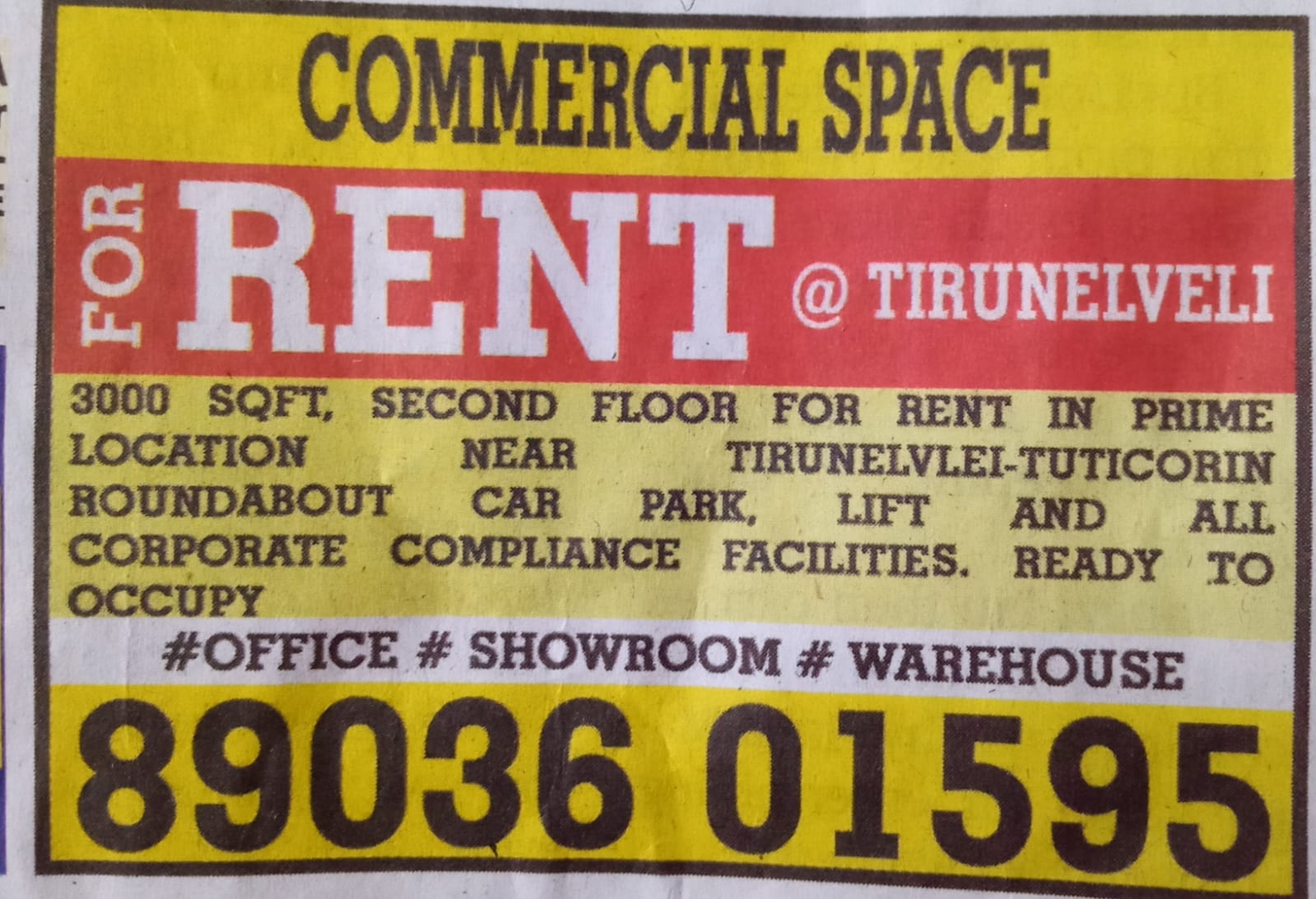 : COMMERCIAL SPACE FOR RENT , THIRUNELVELI TMB TOWERS 2ND FLOOR FOR RENT 3000 SQ . FT . CONTACT NUMBER 9994939626