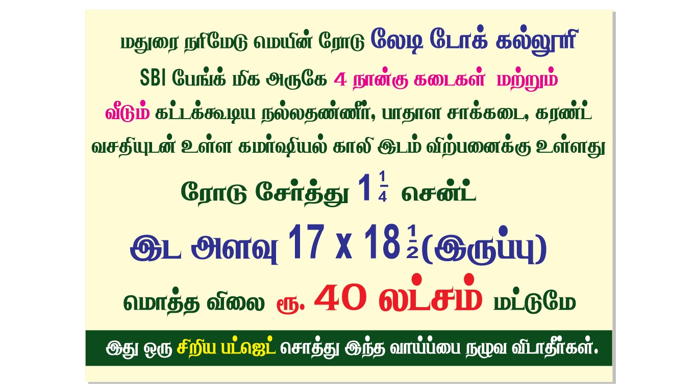 : MADURAI NARIMEDU LADY DOAK COLLAGE NEAR SBI BANK NEAR 1 1/4 CENT 17 18 1/2 40 LAKHS