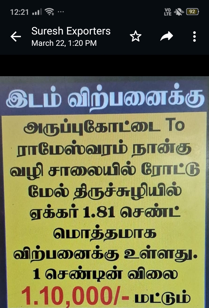 : COMMERCIAL LAND FOR SALE ARUPUKOTTAI TO RAMESWARAN 4 WAY TRACK 1 ACRE 81 CENT THIRUCHULI 1KM FOR LAND AMOUNT FOR 1.10 LAKHS